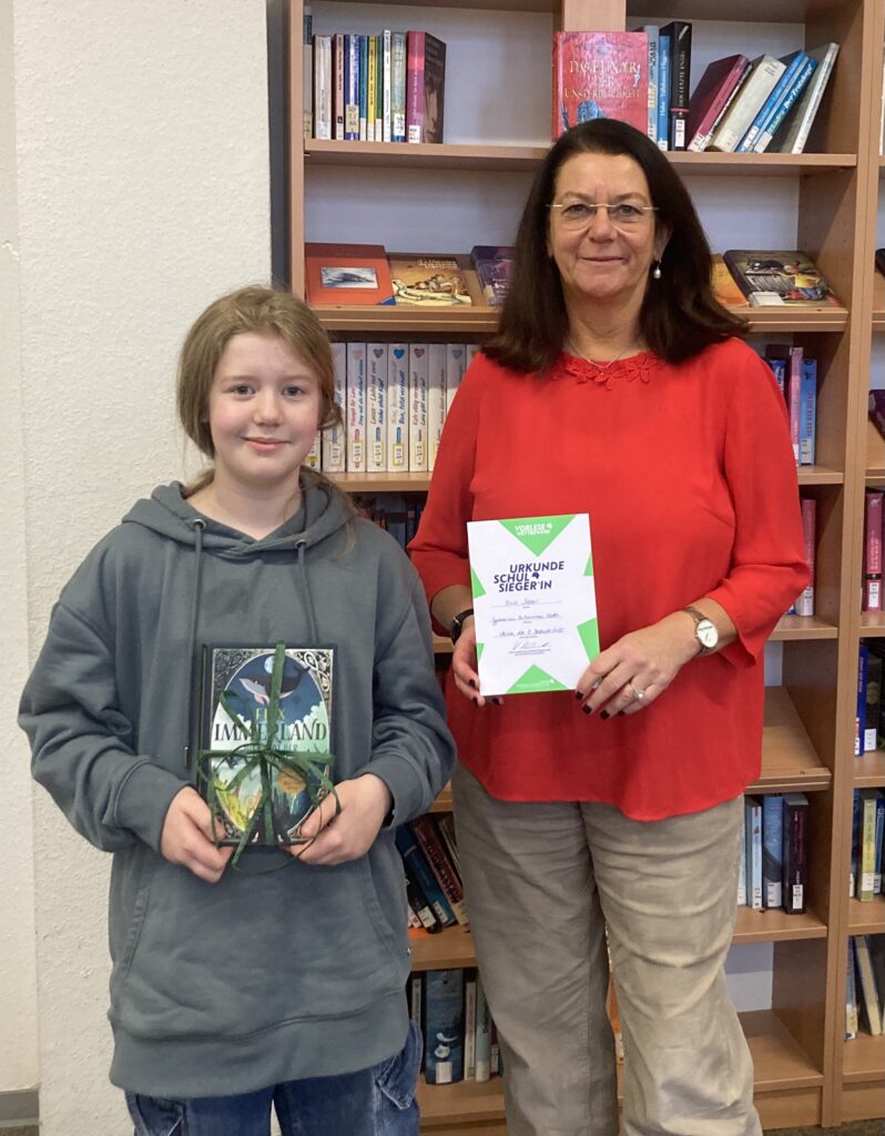 Bei der Preisverleihung lobte Frau Wenzel das Engagement der Schülerinnen und Schüler und betonte, dass das Lesen eine Kunst ist. Sie überreichte allen Klassenbesten einen Schokoladenweihnachtsmann, Enie erhielt die Schulsiegerurkunde und den Roman „Immerland – Die Stadt der Ewigkeit“.