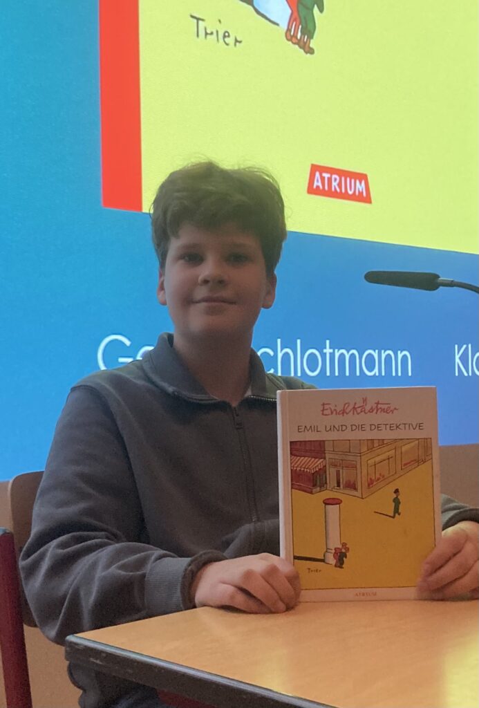 Georg (6b) stellte aus dem Jugendbuchklassiker „Emil und die Detektive“ genau die Stelle vor, die die Detektivarbeit ins Rollen bringt – Emil bemerkt im Zug, dass das vermeintlich diebstahlsicher versteckte Geld nun doch von Herrn Grundeis entwendet worden ist.