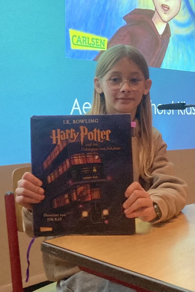 Danach nahm Aenne (6d) die Zuhörerinnen und Zuhörer in der Aula mit in die magische Welt von „Harry Potter und der Gefangene von Askaban“. Harry wird, nachdem er seine Tante mit einem verbotenen Zauber belegt und aufgeblasen hat, von dem Schaffner Stan mit dem Fahrenden Ritter abgeholt.