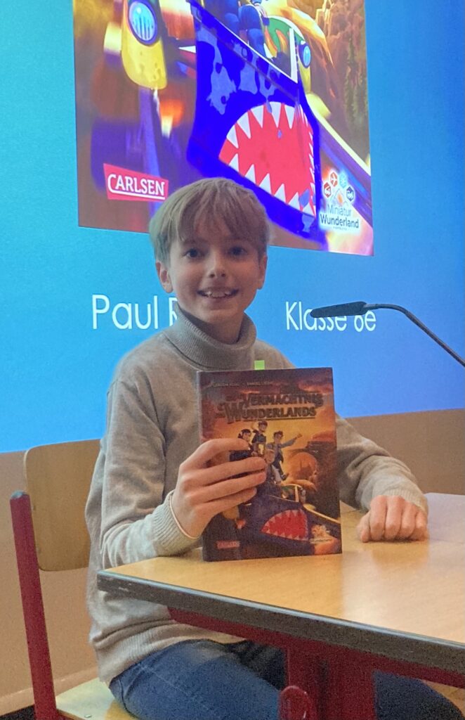 Paul (6e) las aus dem Roman „Vermächtnis des Wunderlands“. Hier finden drei Geschwister die Modelleisenbahn des Großvaters wieder und erleben gemeinsam mit der Freundin Pi verschiedene Abenteuer in dem kleinen Ort Knuffingen. Eine Besonderheit: Szenen aus diesem Buch und die Charaktere der Buchreihe können im Miniatur-Wunderland in Hamburg bestaunt werden.