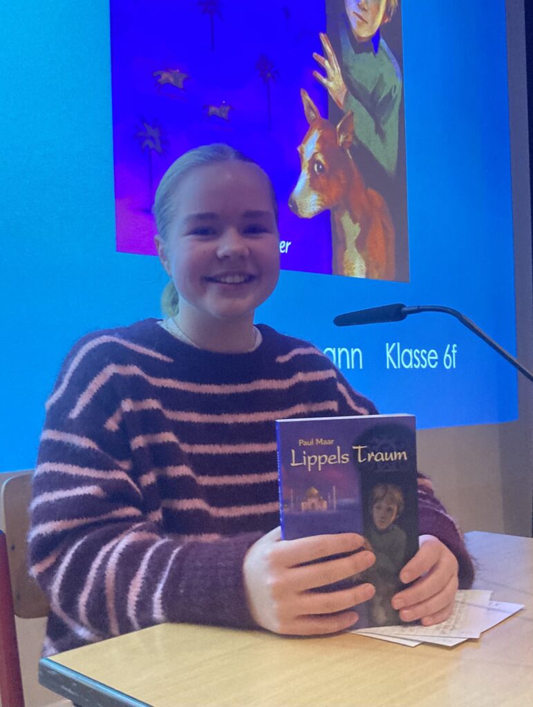 In der von Paula (6f) vorgestellten Textstelle wurde dem Publikum mit dem Buch „Lippels Traum“ die Welt des kleinen Lippel nahegebracht. Seine Eltern sind verreist und haben ihm ein Geschichtenbuch dagelassen, das ihm leider von seinem Kindermädchen wieder weggenommen wird. Damit er die Geschichten trotzdem erleben kann, träumt er sie nun weiter, vermischt sie mit seinem echten Leben und ist in der Wüste ganz allein einem Sandsturm ausgesetzt, als er plötzlich neben sich etwas atmen hört….