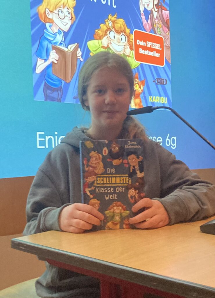 Im letzten Buch, aus dem Enie (6g) vorlas, ging es um eine Klasse, die es zum Glück an unserer Schule nicht gibt: „Die schlimmste Klasse der Welt“. Auch wenn ihr vielleicht schon einmal kurz darüber nachgedacht habt, habt ihr vermutlich noch nie euer Heft mit den nicht so gelungenen Mathearbeiten angezündet. Oder?!