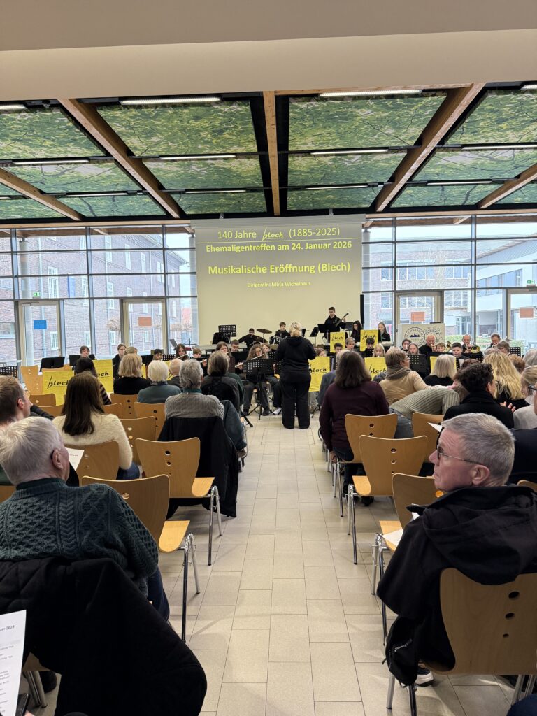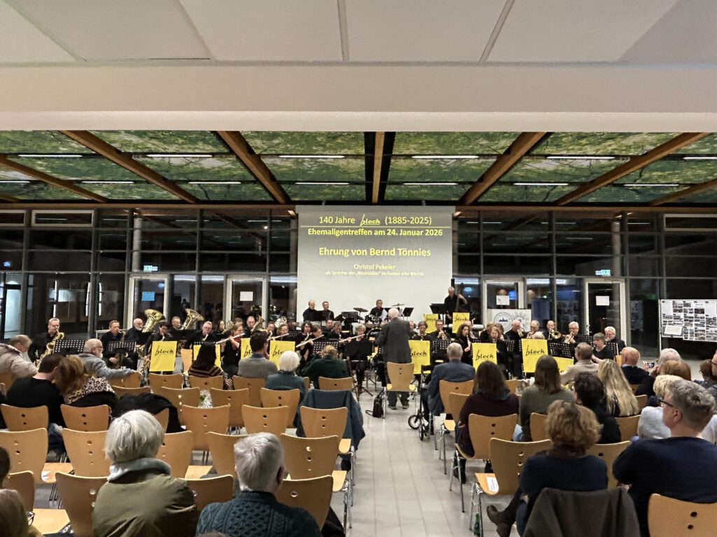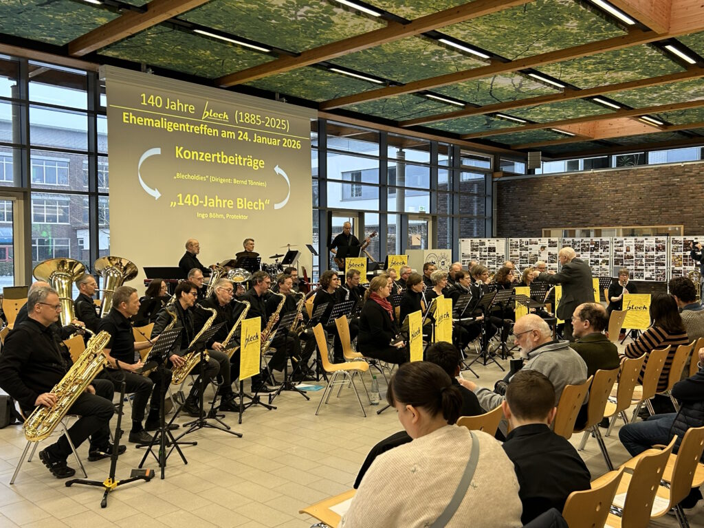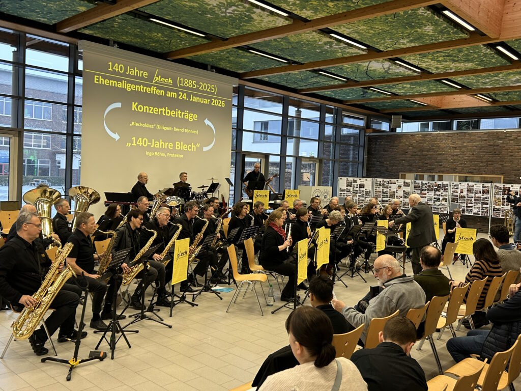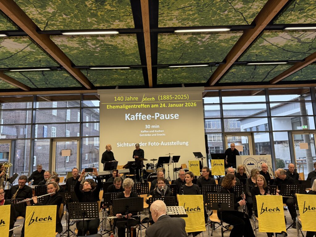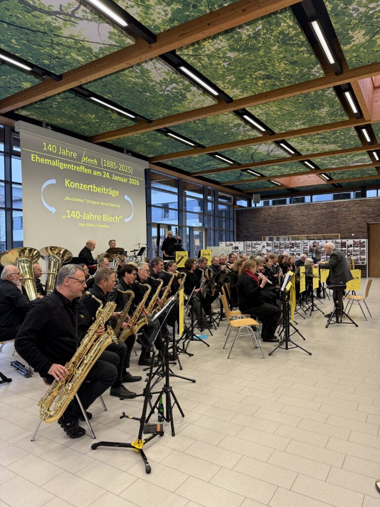 Anlässlich des 140-jährigen Bestehens des „Blech“ wollen wir diese lange Tradition im Rahmen eines Ehemaligentreffens am 24. Januar 2026 in der Europahalle des GAV angemessen würdigen. Geplant ist nicht nur eine Zusammenkunft ehemaliger und aktueller „Blechis“ sowie ehemaliger und aktueller musikalischer Leitungen und Protektoren, sondern auch das gemeinsame Musizieren. Wir freuen uns jetzt schon auf Darbietungen der „Alt-Blechis“ und der „Jung-Blechis“, die vielleicht auch das eine oder andere Stück gemeinsam präsentieren können. Wie wollen auch ehemalige musikalische Leitungen ehren, allen voran Bernd Tönnies, der in Aussicht gestellt hat, die Alt-Blechis noch ein letztes Mal zu dirigieren. Wir können im Anschluss in gemütlicher Atmosphäre bei Speis und Trank in Erinnerungen schwelgen, von legendären Blechfahrten berichten und andere Erfahrungen austauschen.