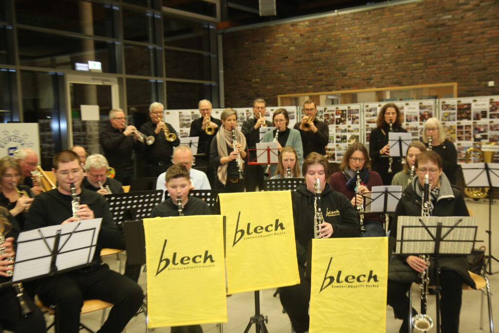 Das „Blech“ wurde im Jahr 1885 als Schülerverein gegründet und feiert Jahr 2025 sein 140 jähriges Bestehen. Angefangen als klassische Blaskapelle mit Marschmusik hat sich das Ensemble gemeinsam mit seinen Musikern über die Jahre gewandelt. Mittlerweile prägen Titel aus dem Bereich Rock/Pop und Swing das Repertoire des „Blech“. Neben den üblichen Aktivitäten wie das alljährliche „Blechwecken“, Platzkonzerte zu Schulanlässen, musikalische Begleitung von Prozessionen und konzertanten Aufführungen spielte das „Blech“ z.B. beim Mutterjulienfest des ULF oder auch im Metropol anlässlich der Verleihung der Preise für die Sieger der Lese-Profis-Aktion der OV. Eine neue Erfahrung war ein Einsatz im Rasta-Dome, bei dem das „Blech“ beim Endspiel der Young-Rasta-Dragons 2017 die Mannschaft musikalisch unterstützte, wie es bei amerikanischen Sportspielen der Fall ist. Reisen und Austauschfahrten gehören zur Tradition des „Blech“. Das „Blech“ segelte auf dem Ijsselmeer und fuhr nach Ameland und Schweden und unternimmt regelmäßig Probenwochenenden in Jugendherbergen im Umland. Der Höhepunkt dieser Fahrten war 2016 die Reise nach Mjölby in Schweden, zu einem internationalen Orchestertreffen. Zu dem Mjölbyer Orchester Ungdomsmussikar mit 90 Mitgliedern pflegt das „Blech“ schon seit nunmehr 58 Jahren eine Austauschtradition. 2017 war das schwedische Orchester „Mjölby Ungdormsmusikkar“ dann zu Gast in Vechta – und das auch schon zum zehnten Mal. Das schwedische Orchester „Mjölby Ungdormsmusikkar“ feiert 2025 ihr 70jähriges Bestehen. Das Blech gratuliert herzlichst! Auch wenn uns aus organisatorischen Gründen eine Fahrt nach Schweden zur Zeit leider nicht möglich ist, so ist doch für den Juni 2026 eine mehrtägige Blechfahrt geplant.